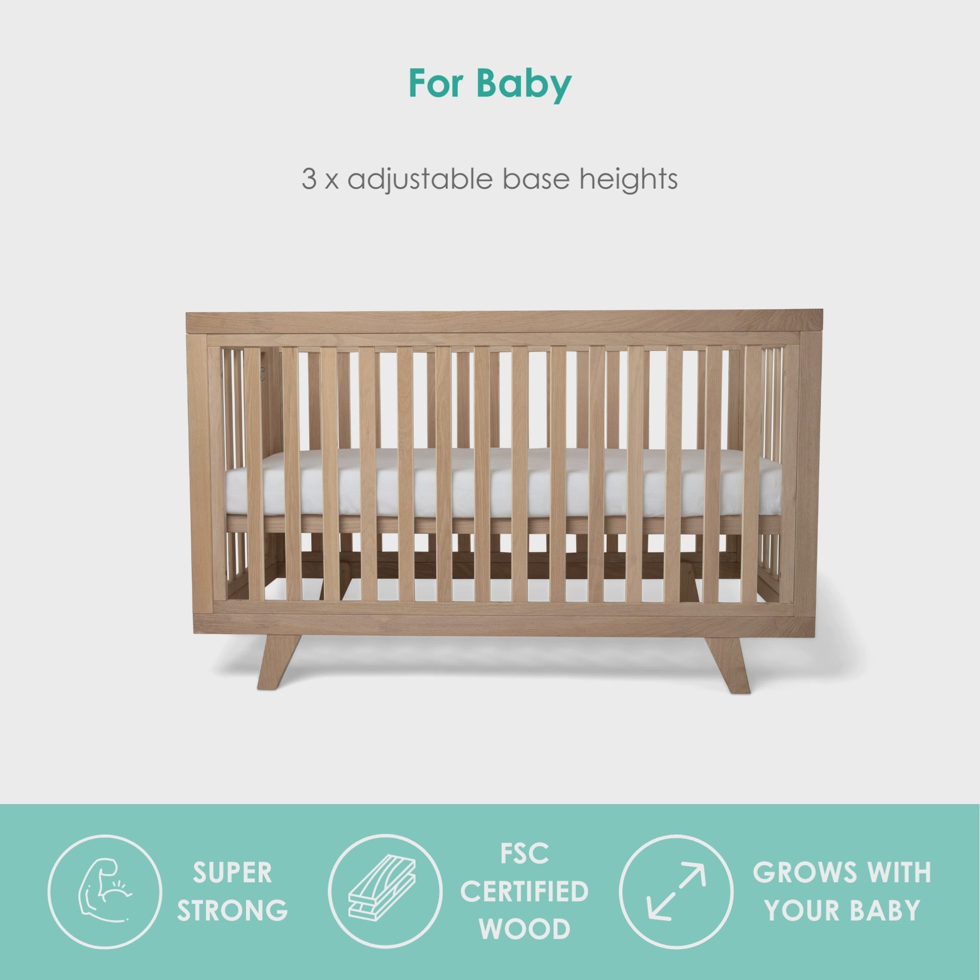 The Clair de Lune Oak Cot Bed - Natural Oak is a practical and long-term nursery solution, made from FSC-certified solid Oak for a strong and natural finish. Its clean lines and neutral tone make it suitable for a variety of nursery styles, from traditional to modern.