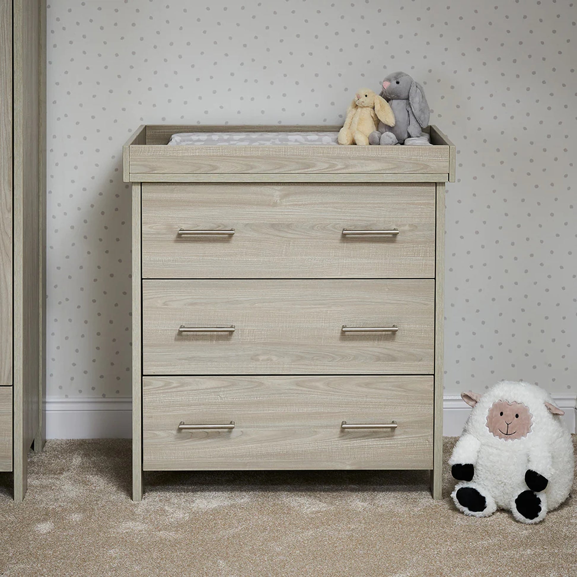 • Spacious storage layout: Deep drawer and cupboard space keep nappies, clothing and essentials neatly organised.