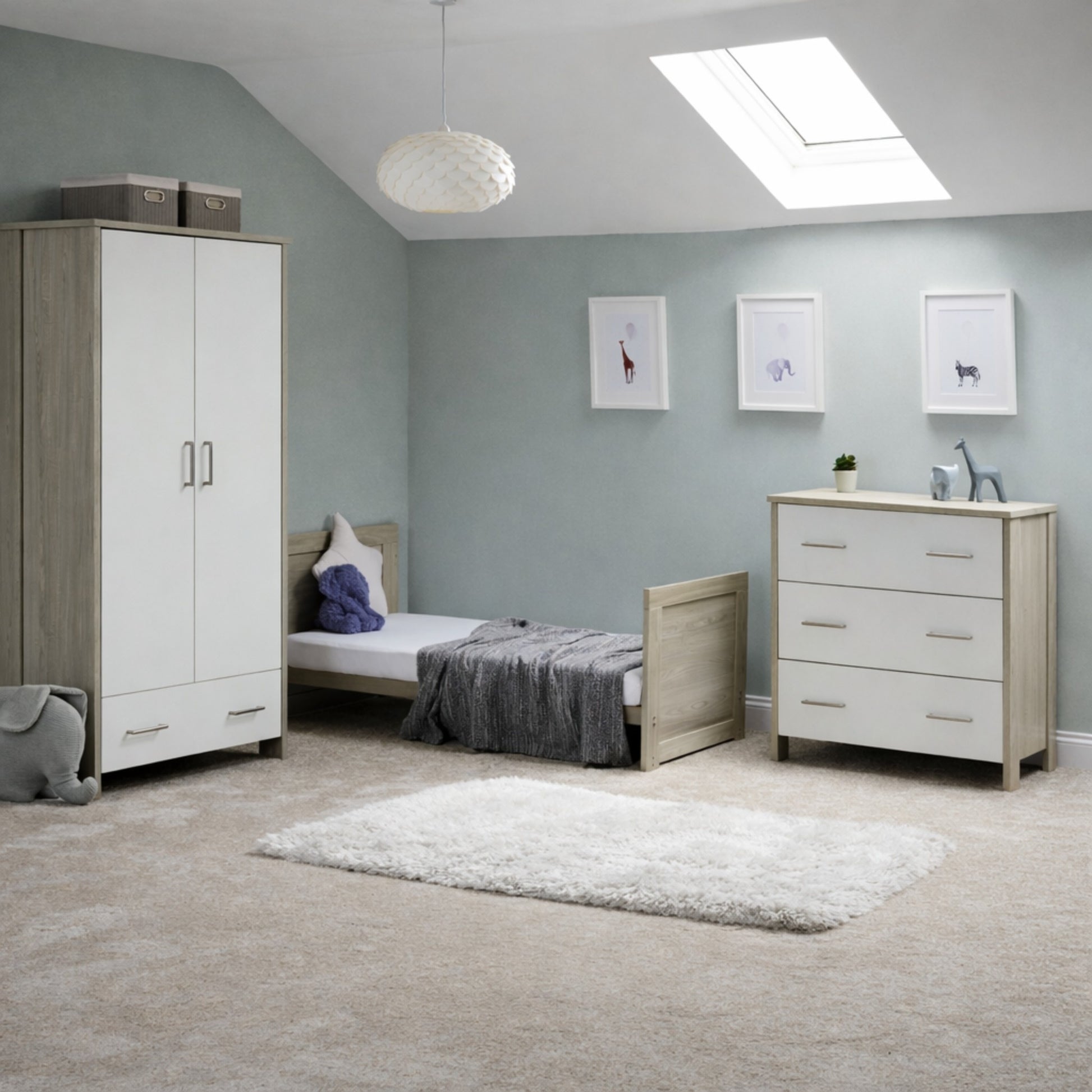 The Obaby Nika Cot Bed – Grey Wash & White brings modern style and practical functionality into the heart of your nursery. With its textured wood-effect grey wash combined with white detailing and clean lines, it offers a sophisticated aesthetic that fits effortlessly into today’s interiors. Designed to support your child’s early sleep stages and beyond, it’s a fantastic choice for parents seeking both style and durability.