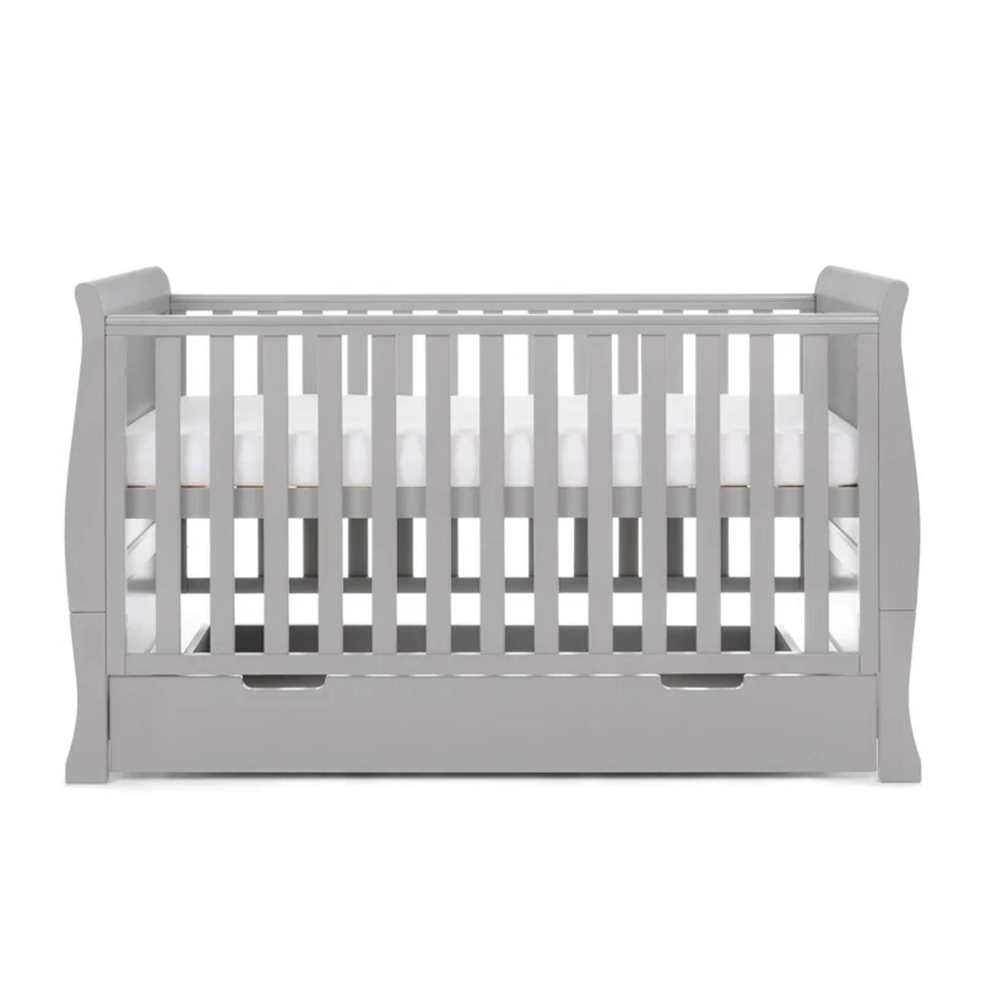 The Obaby Stamford Classic Sleigh Cot Bed in Warm Grey at Dreamy Nursery blends classic design with contemporary nursery style. Its elegant sleigh shape and soft neutral finish make it a sophisticated centrepiece for any baby’s room.